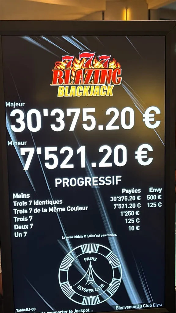 Ce jeudi, un joueur du Paris Élysées Club a remporté 30 376 € grâce à un triple 7 identique obtenu sur l’une de nos tables de Blackjack, déclenchant le paiement immédiat du side bet associé.